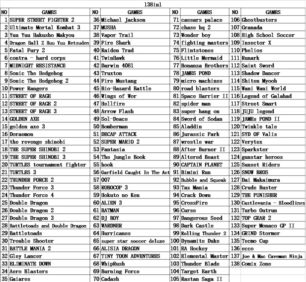 - Product name : 138 in 1 Hot Game Collection For SEGA GENESIS MegaDrive 16 bit Game Cartridge For PAL and NTSC Game